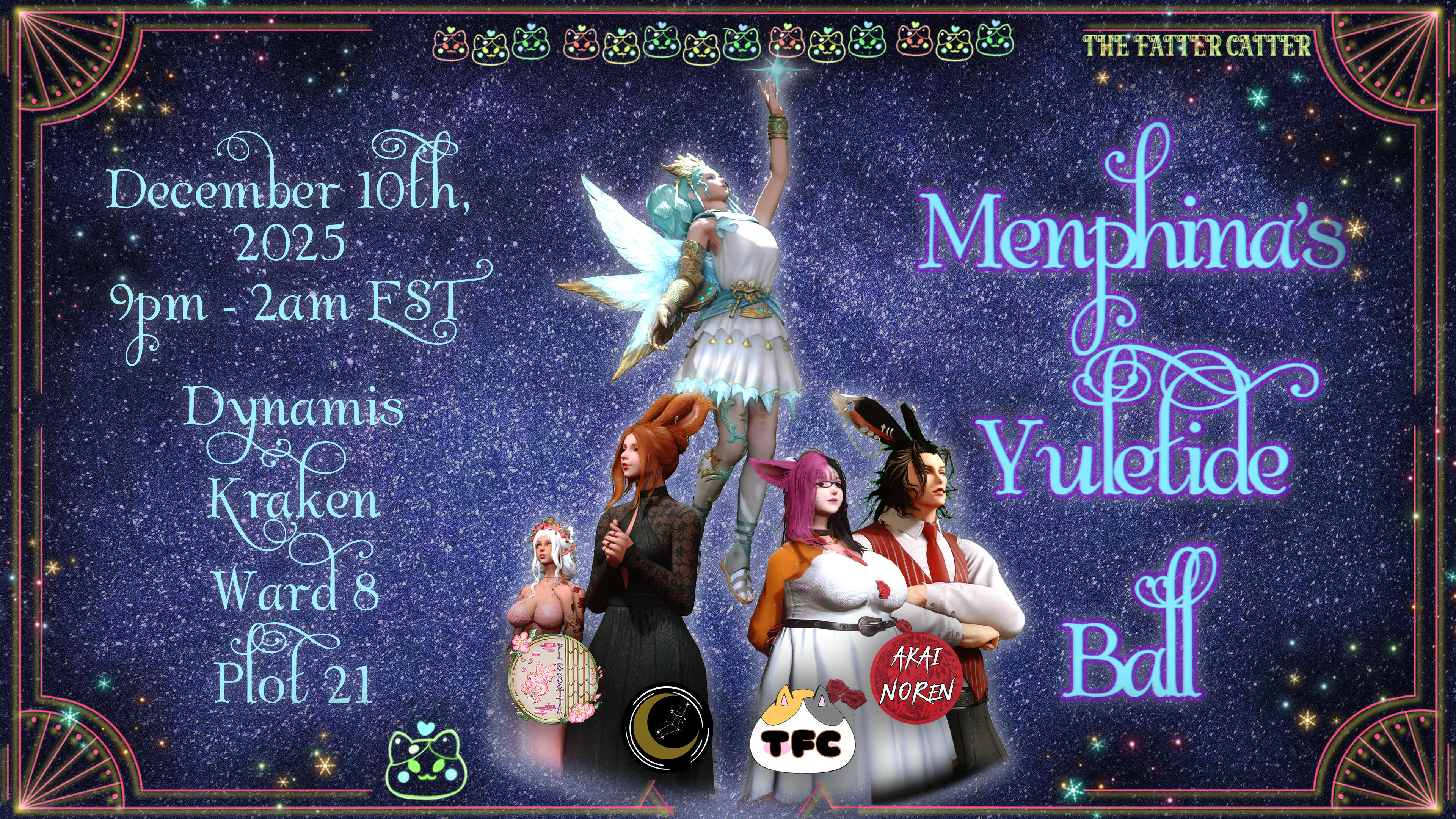 "The winds bring chills from the north, but upon the very same winds comes magic, and whispers of love. Please join the Fatter Catter lounge and spa, Florette Athenaeum, The Spire, and Akai Noren for a night celebrating each other with music, a quest to help a miqo find love, a celebration of art and music, and much much more!"